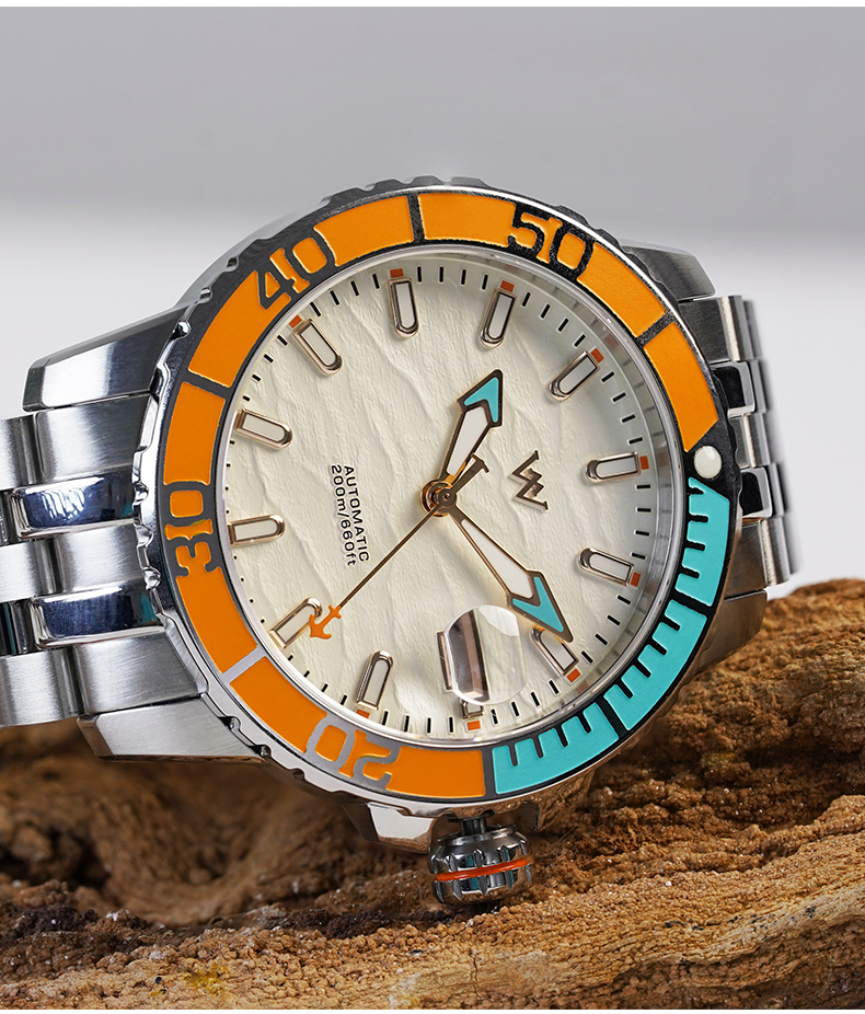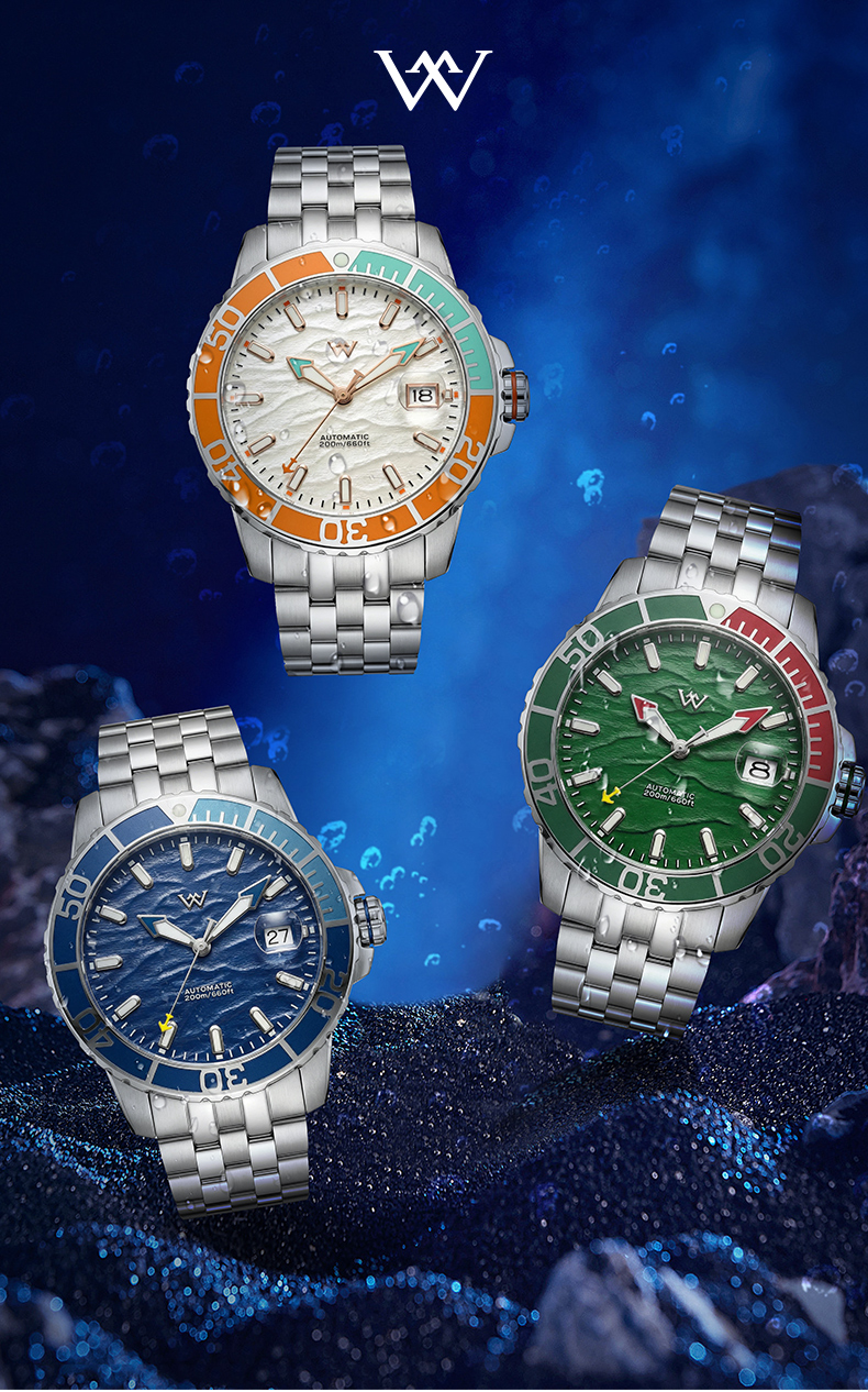 Dial Options: Off-white, Ocean Blue, and Green — all featuring a stamped wave pattern