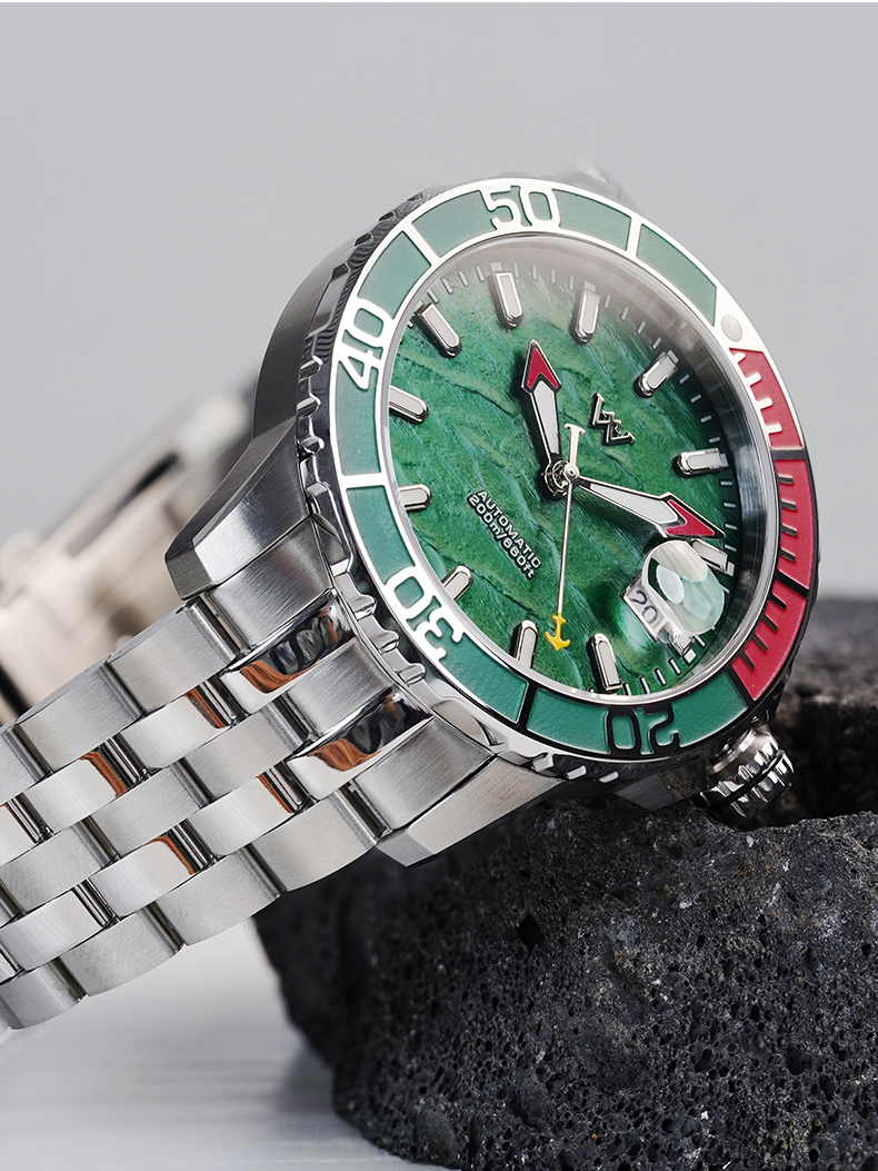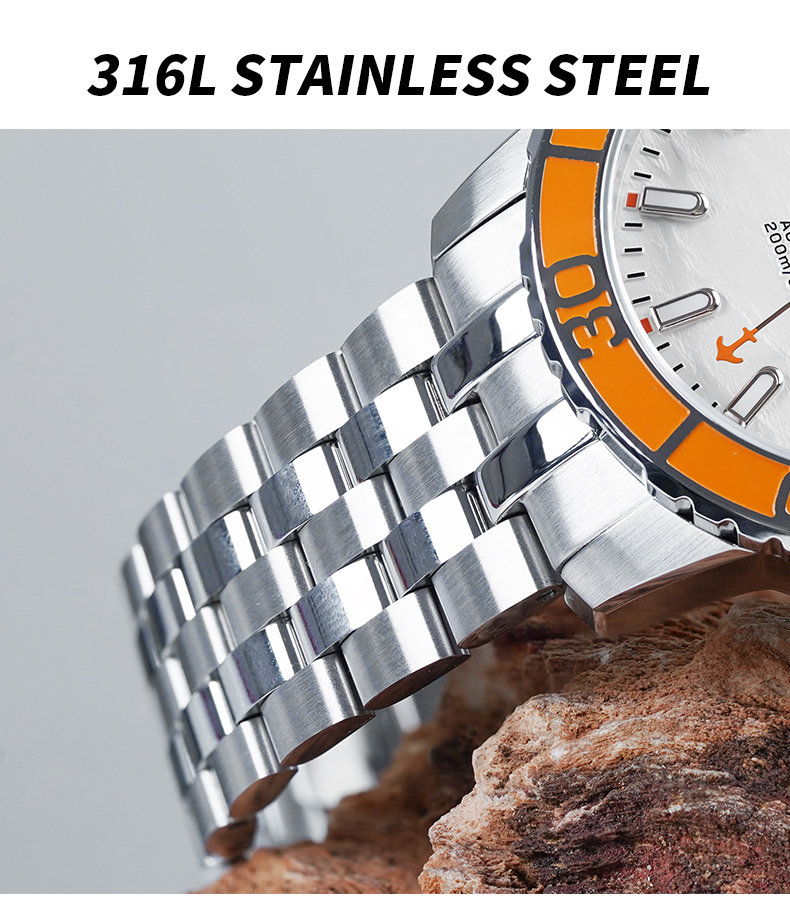 Bezel: Unidirectional rotating bezel with 316L stainless steel base and heat-cured paint inlay