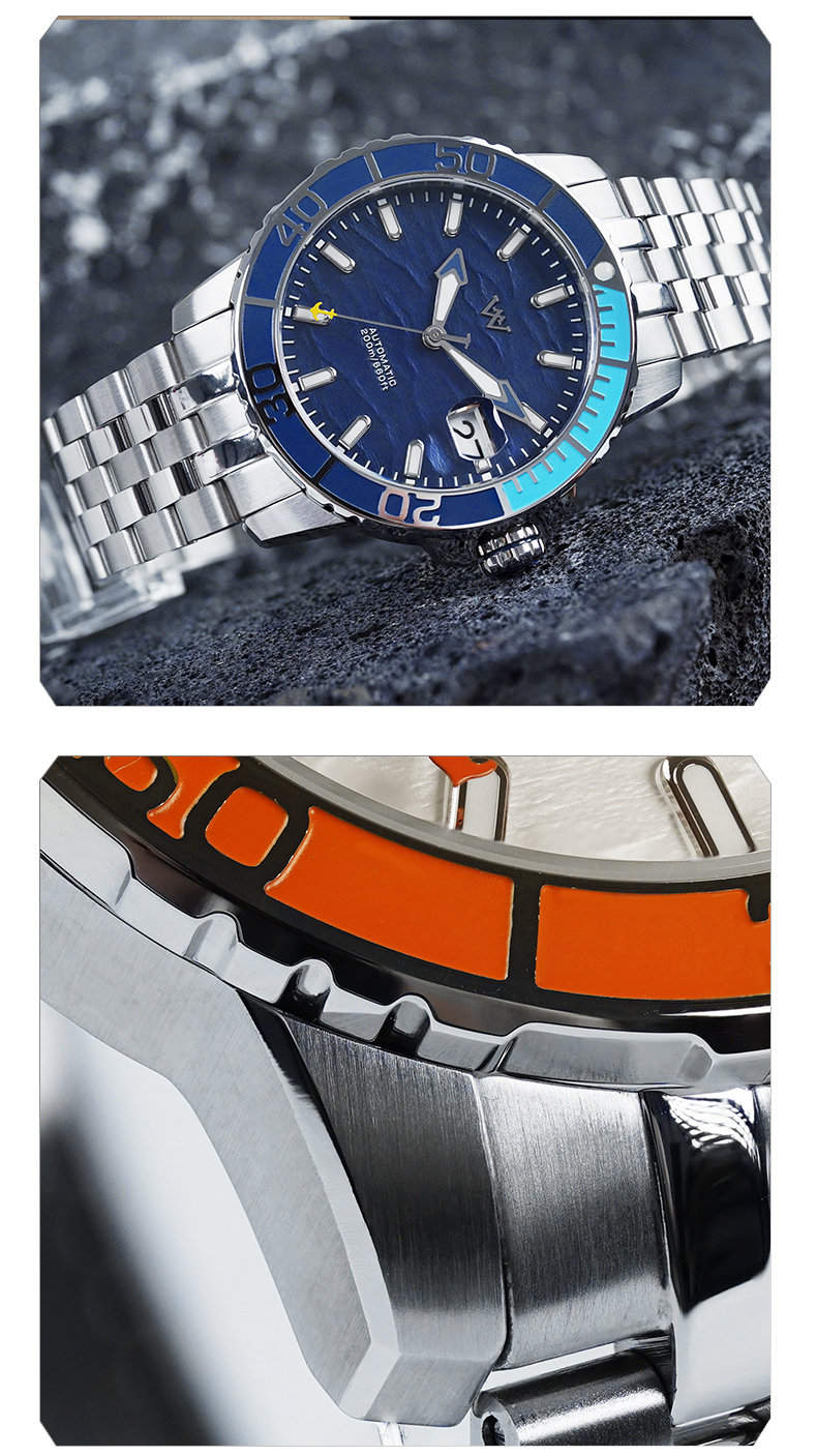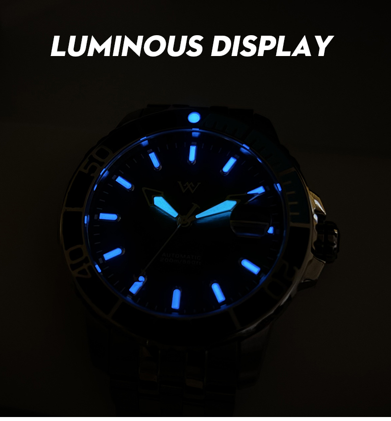 Lume: Blue luminescent coating on hour and minute hands, hour markers, and the 12 o’clock bezel pip