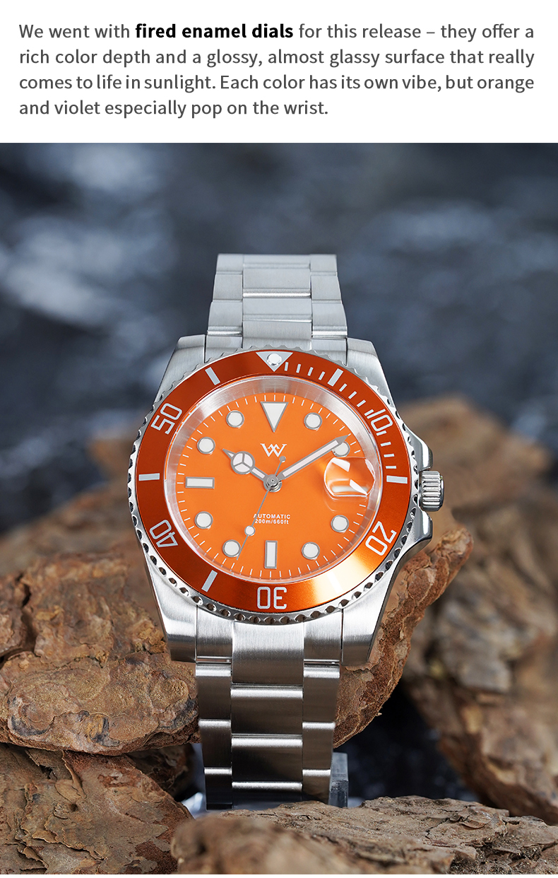 We opted for fired enamel dials — known for their deep, rich colors and glossy, almost glass-like finish that truly shines in sunlight. Each color brings its own unique character